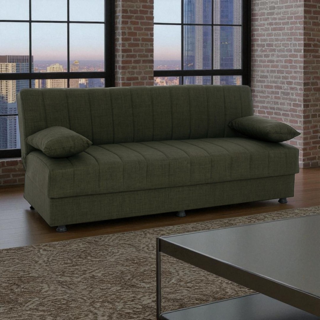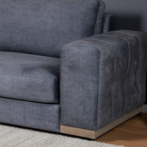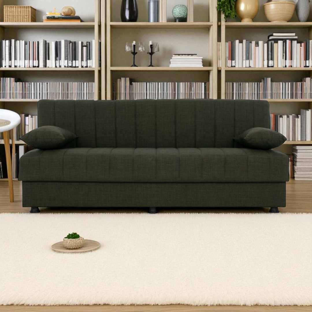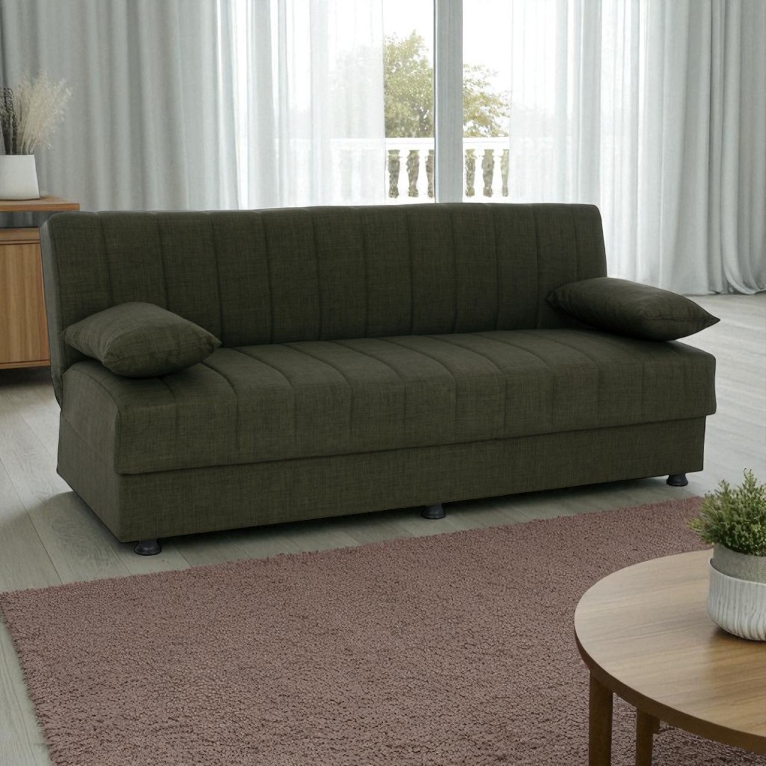 Ξεκινώντας από τα βασικά και τα προφανή, το χρώμα της επένδυσης με το εξαιρετικό και καλοραμμένο ανάγλυφο ύφασμα αυτού του καναπέ, είναι dark olive.