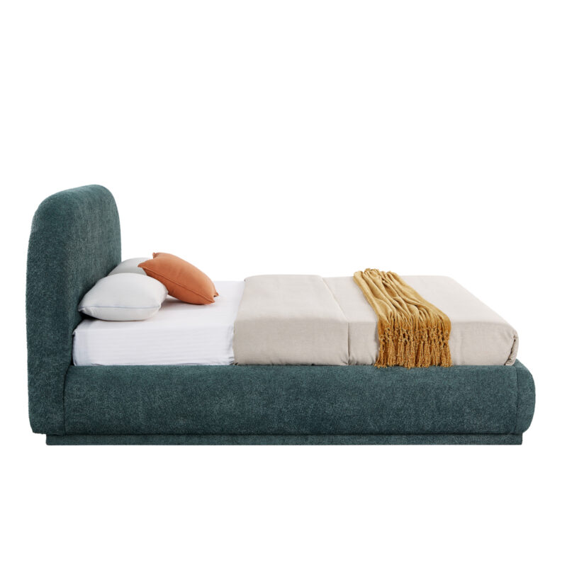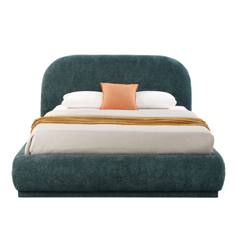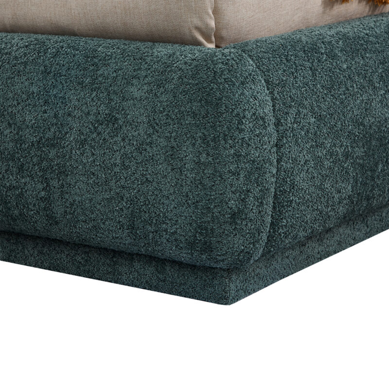 Επενδυμένο με «ζεστό» και πολυτελές Chenille ύφασμα σε ΠΡΑΣΙΝΟ χρώμα και με λιτό design με όμορφες «γραμμές» χωρίς πόδια αφού το κρεβάτι «κάθεται» στο πάτωμα, θα αποτελέσει σημείο αναφοράς.