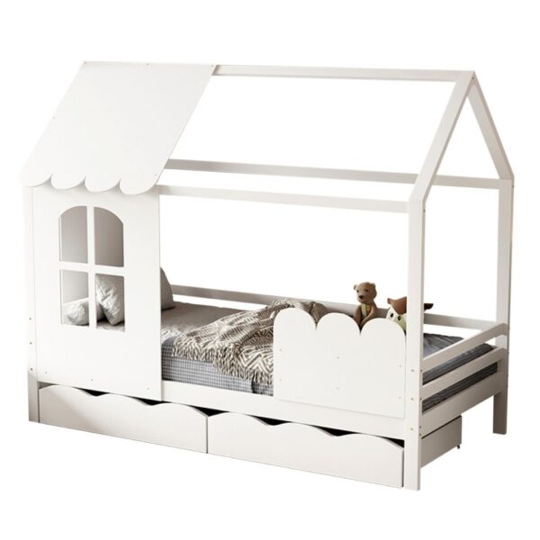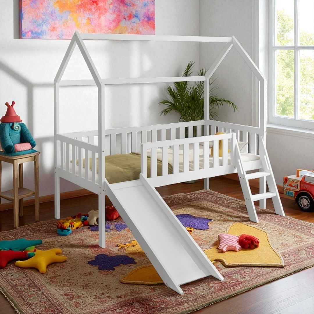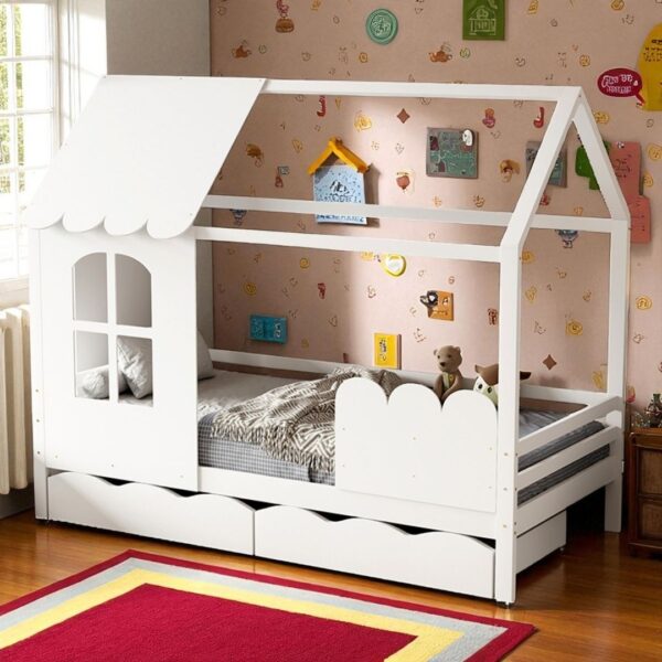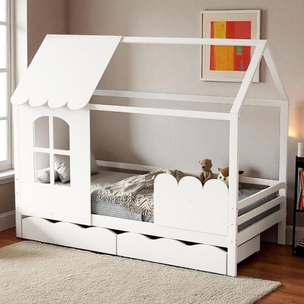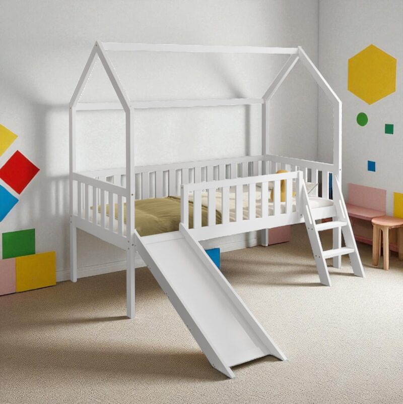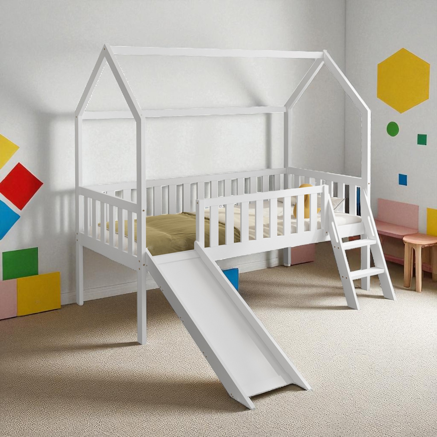 Το στρώμα τοποθετείται σε τάβλες κατασκευασμένες από ξυλεία κόντρα πλακέ. Ολόκληρο το κρεβάτι είναι υπερυψωμένο και έχει σχήμα σπιτιού αλλά αυτό που κάνει τα παιδιά να το λατρέψουν είναι ότι διαθέτει τσουλήθρα προσφέροντας ατελείωτες ώρες παιχνιδιού και χαράς.