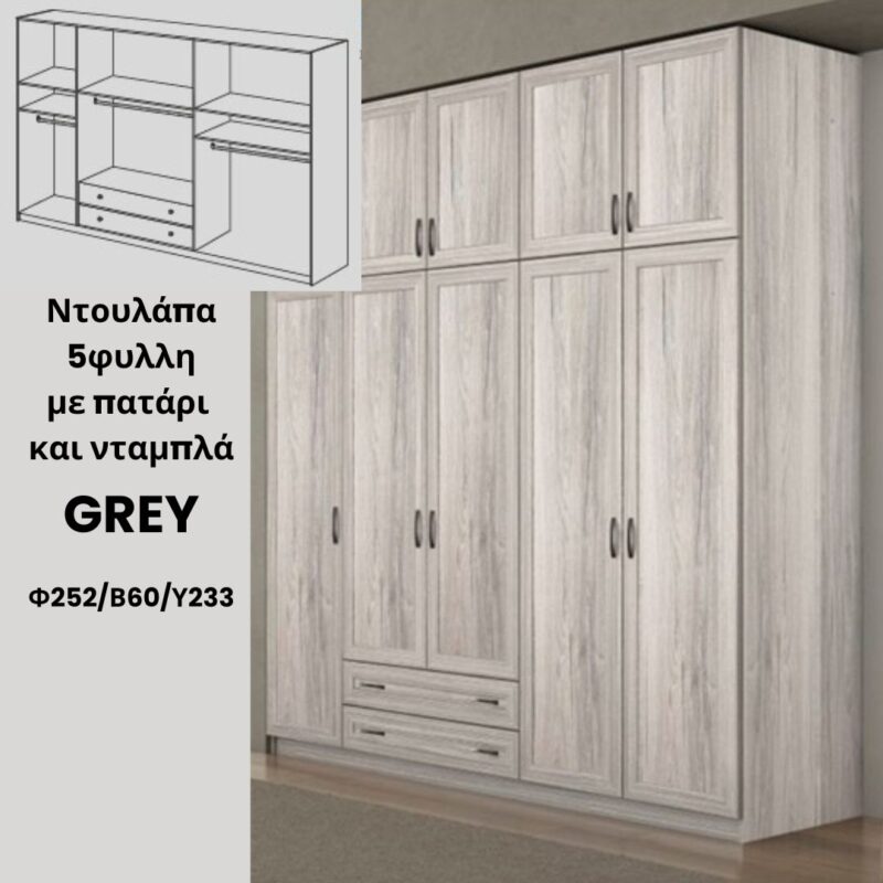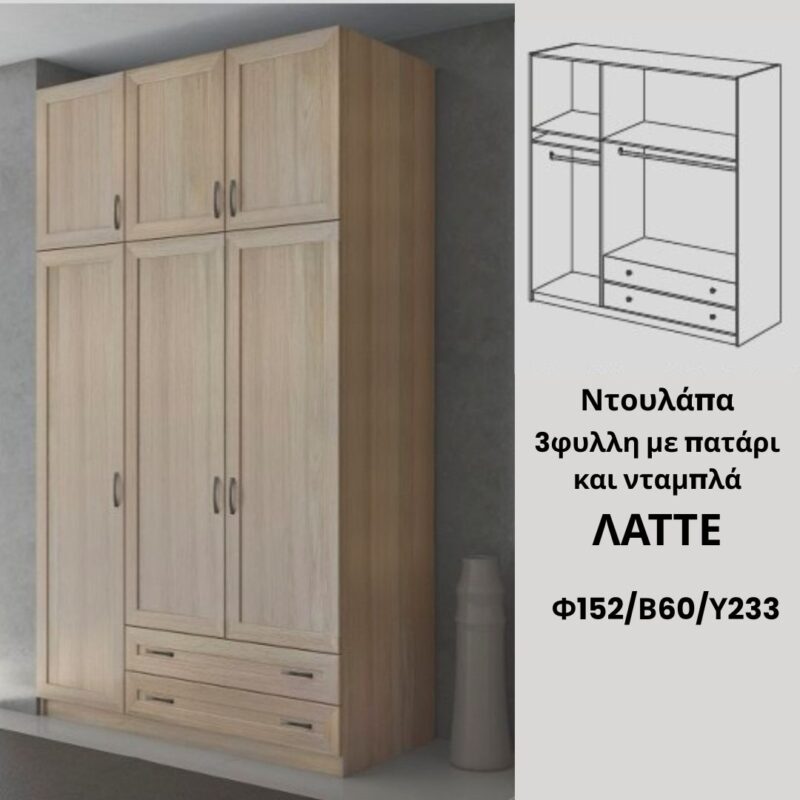 Μια ντουλάπα νταμπλαδωτή, 2φυλλη με εξαιρετική, διαχρονική αισθητική και πατάρι σε διάσταση 102*233*60 (ως έχει στην φωτογραφία) . Διατίθεται από 2φυλλη έως και 5φυλλη σε δύο αποχρώσεις: Wenge και Moca.