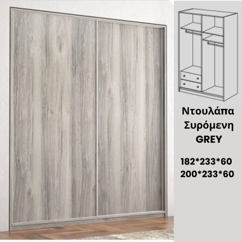 Μια ντουλάπα συρόμενη, 2φυλλη με εξαιρετική, διαχρονική αισθητική, σε Διάσταση 182*233*60 με 2 συστάρια και 2 θέσεις για κρεμαστά (ως έχει στην φωτογραφία) .