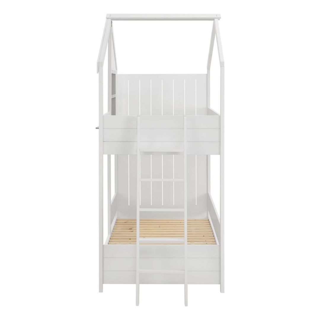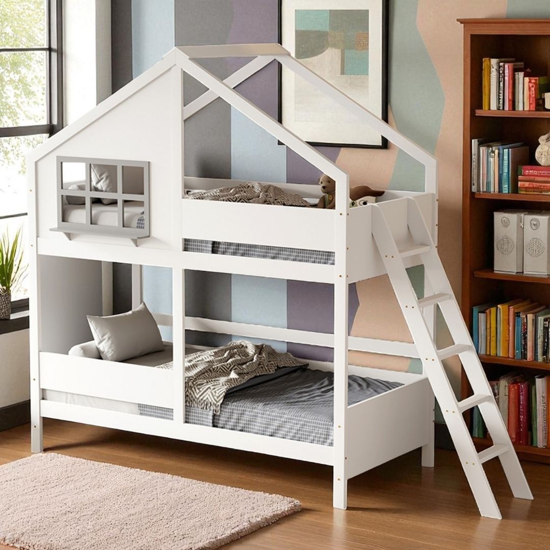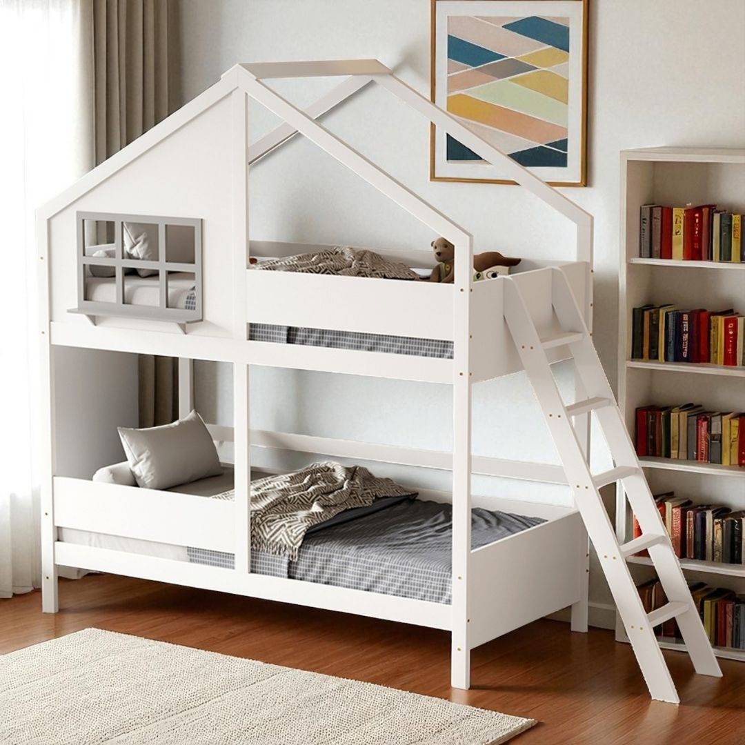 Η κουκέτα έχει σχήμα σπιτάκι και μάλιστα το επάνω κρεβάτι έχει κι ένα παραθυράκι με εξωτερικό ράφι που θα εξάψει την φαντασία των παιδιών.