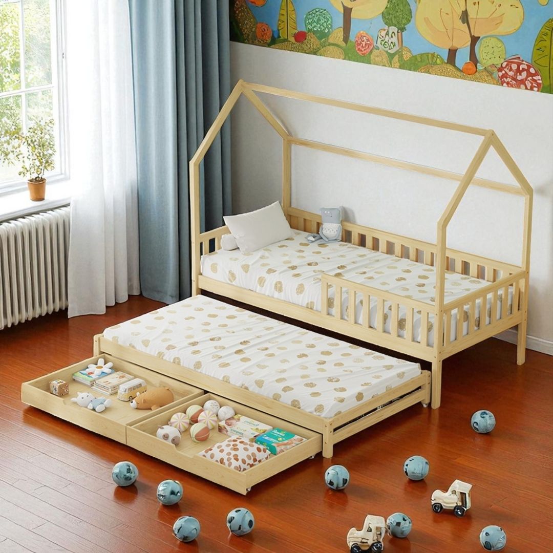 Τα στρώματα τοποθετούνται σε τάβλες κατασκευασμένες από ξυλεία κόντρα πλακέ. Ολόκληρο το κρεβάτι έχει σχήμα σπιτιού και μάλιστα αρκετά ψηλό, που θα δώσει μια ευχάριστη, «ζεστή», και παιχνιδιάρικη όψη σε κάθε παιδικό δωμάτιο.