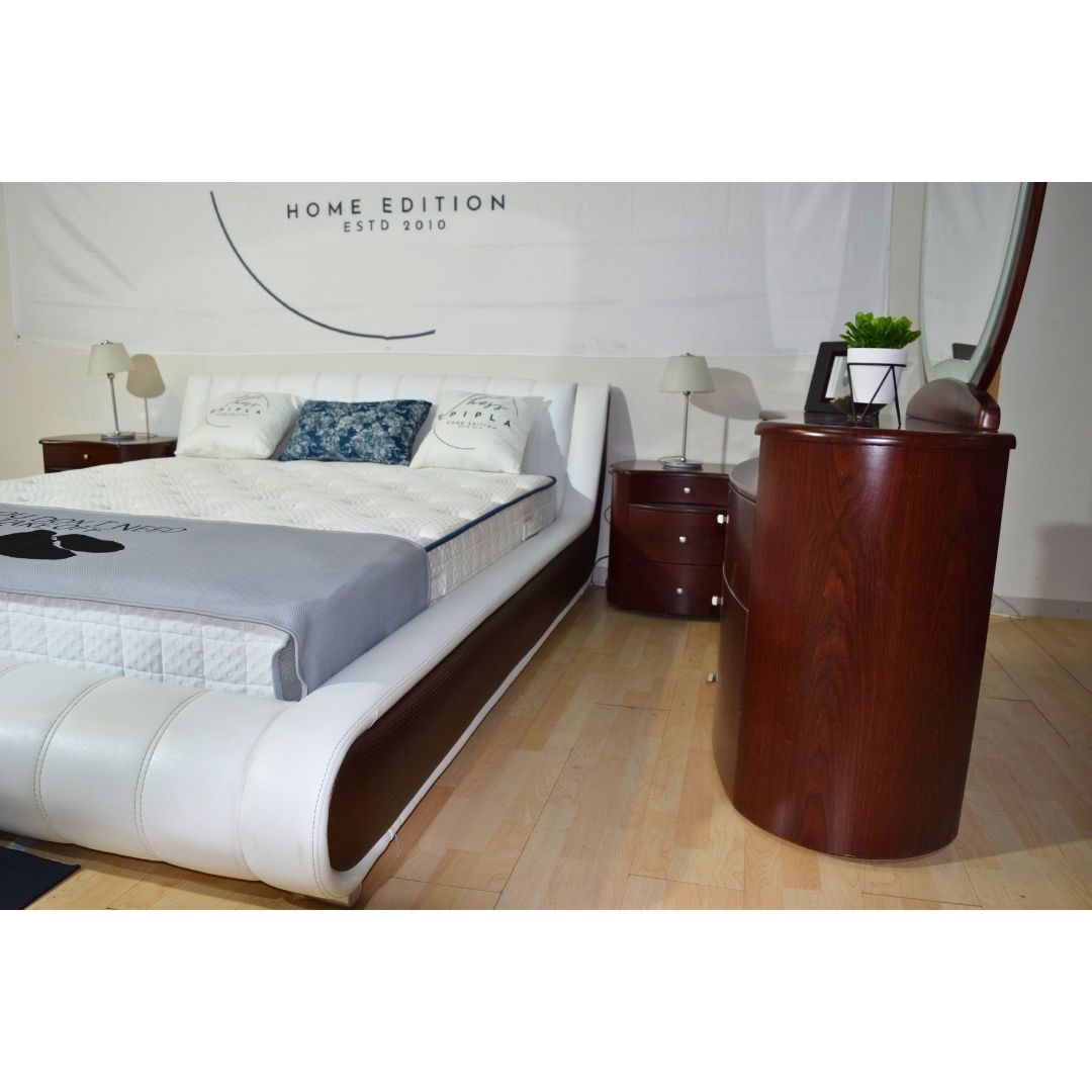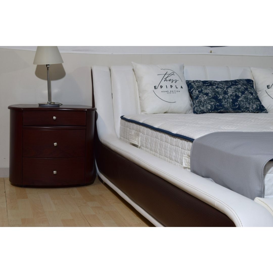Το σετ “Naxos” συνδυάζει το λευκό δέρμα με ξύλινες λεπτομέρειες σε καμπύλες γραμμές, προσφέροντας μια αίσθηση πολυτέλειας και ζεστασιάς στο υπνοδωμάτιο.
