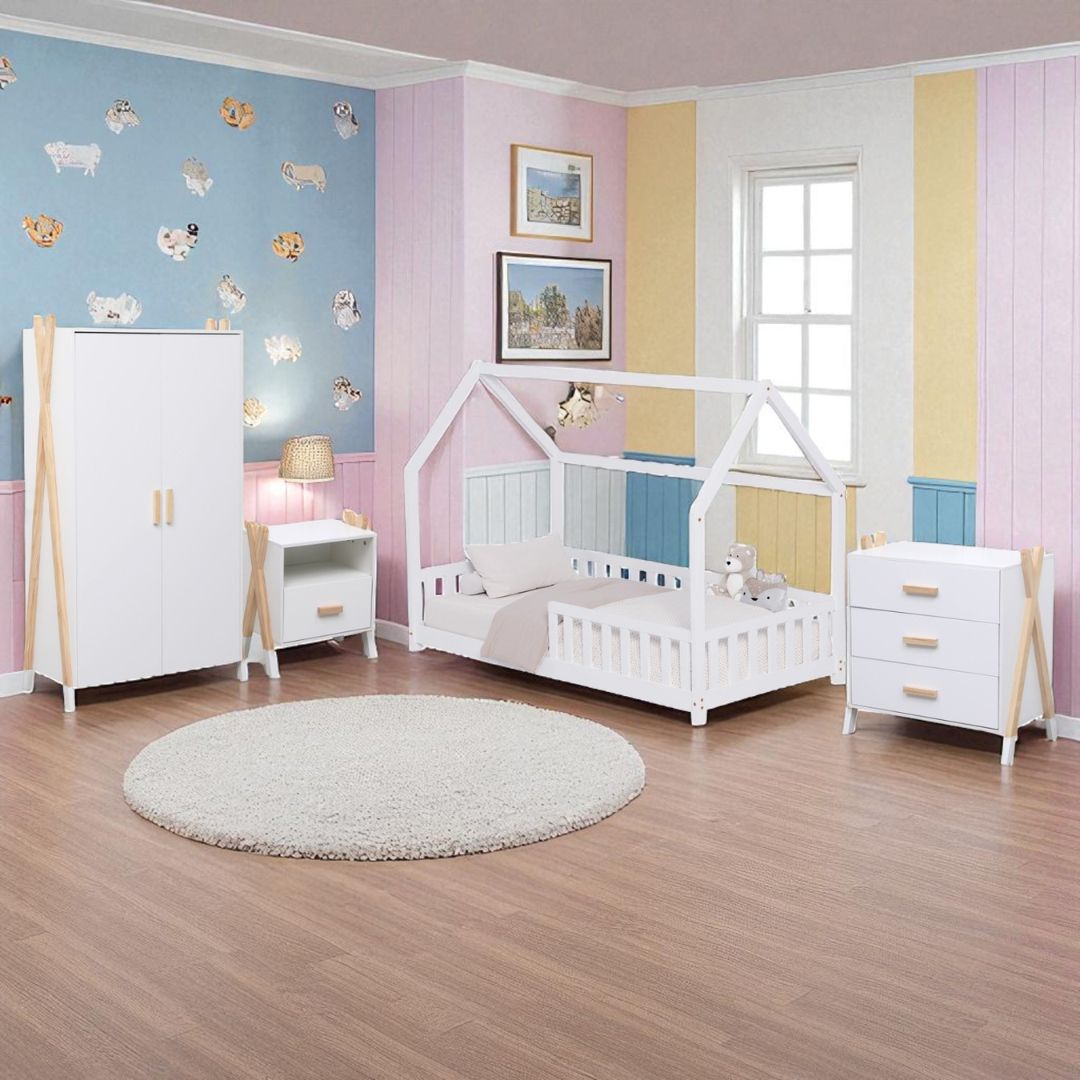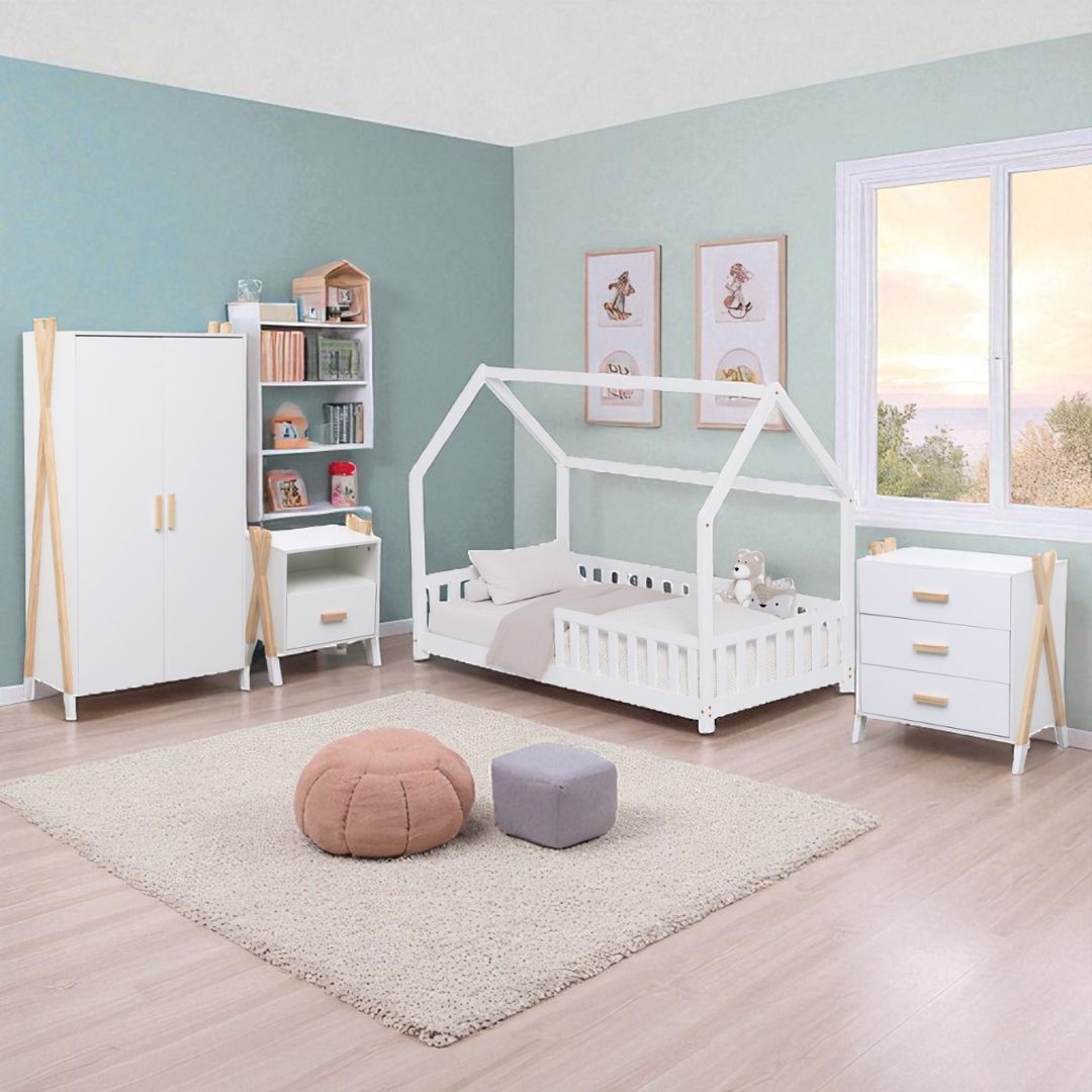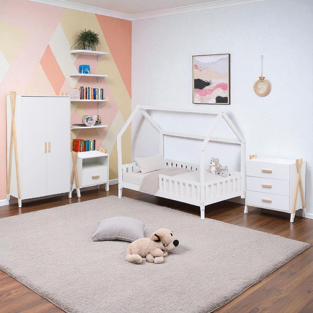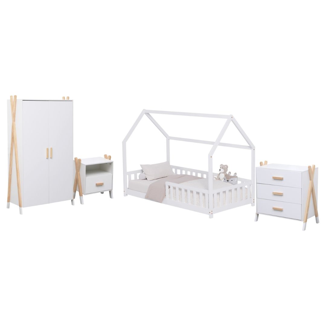 To σετ για παιδικό δωμάτιο FIMIS περιλαμβάνει ένα κομοδίνο, ένα κρεβάτι τύπου Montessori με περιμετρικά κάγκελα, μια ντουλάπα, και μια συρταριέρα!