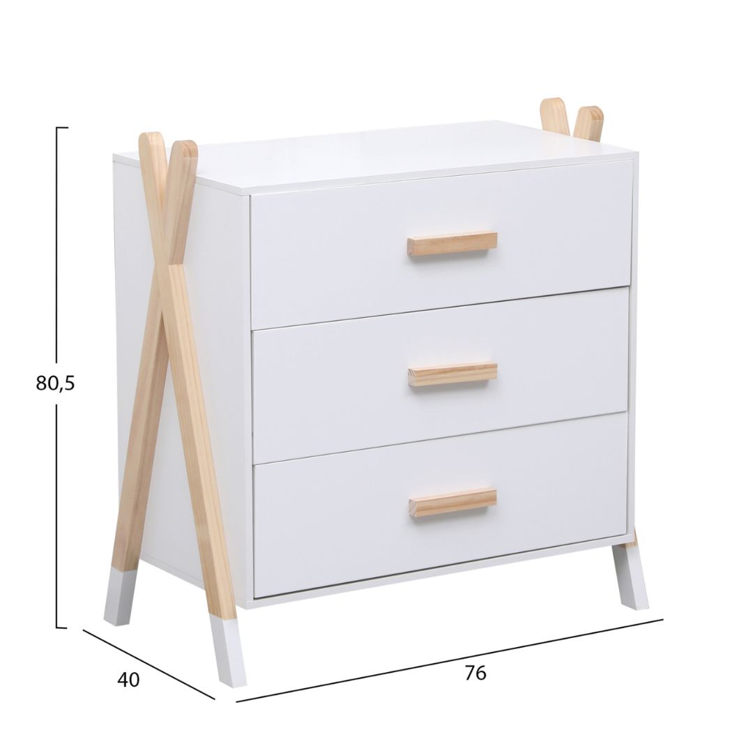Παιδική συρταριέρα με 3 συρτάρια. Μελαμίνη σε ΛΕΥΚΟ χρώμα με σκελετό ξύλου πεύκου σε χιαστί διάταξη.